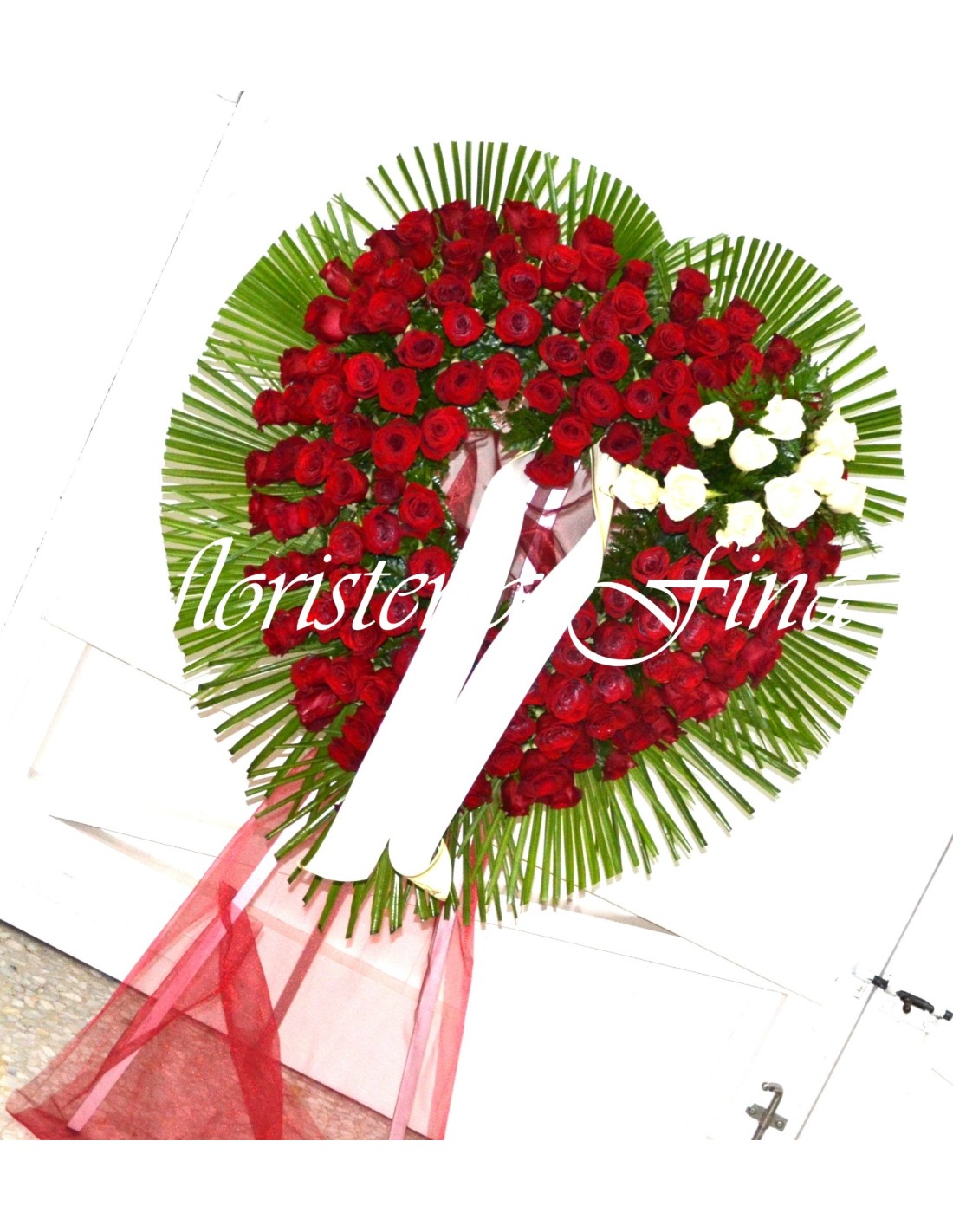 Corona funeraria en forma de corazón con rosas rojas y detalles de rosas blancas. Un homenaje floral romántico y lleno de amor para una despedida eterna.